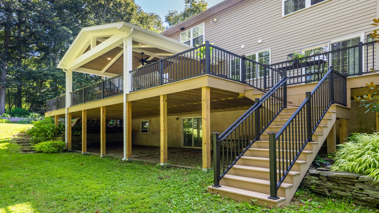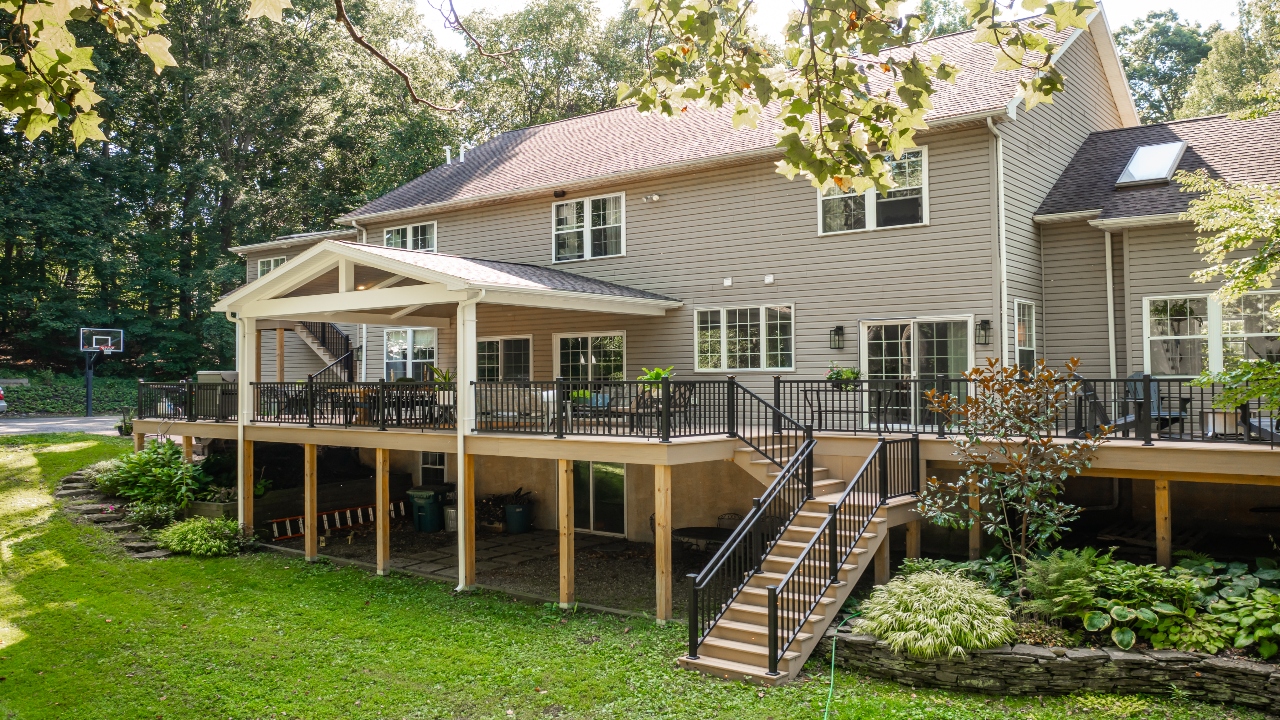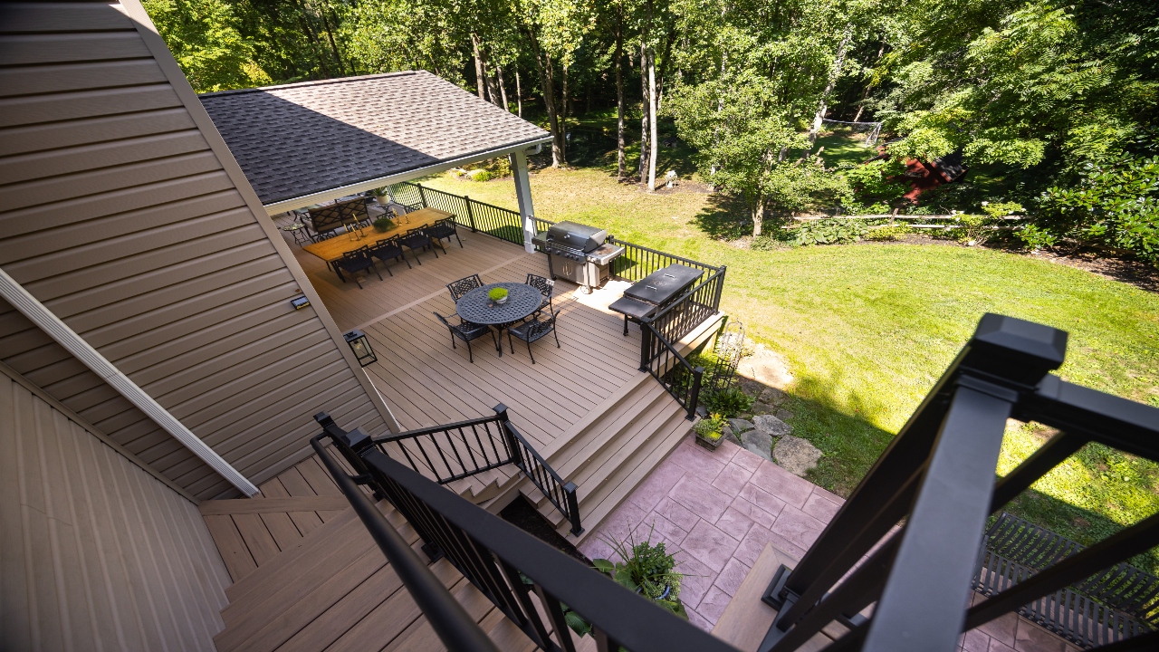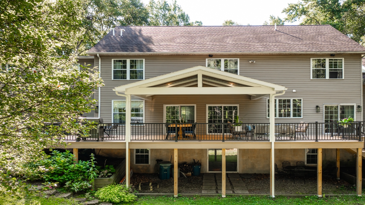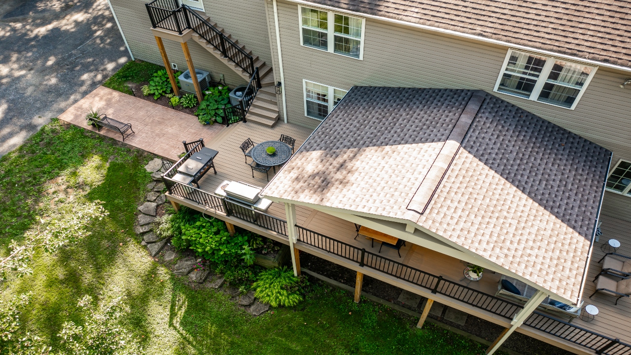 We removed the old deck and built a 1,200 sqft composite deck. The new deck incorporates multiple access points to the yard and second story, seamlessly integrating with a connecting stamped concrete walkway to create a cohesive backyard environment. We built an A-frame style roof with a finished cathedral ceiling over a section of the deck to create a perfect place to dine during hot sunny days.
