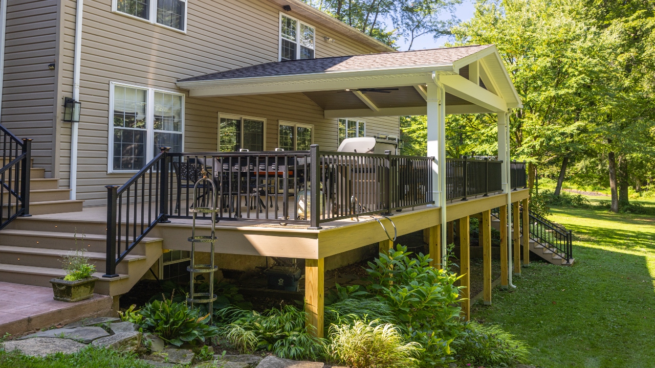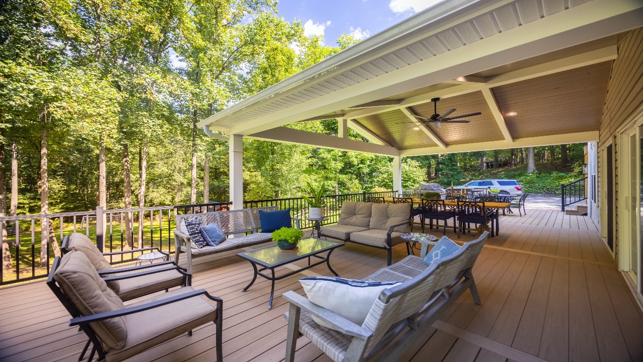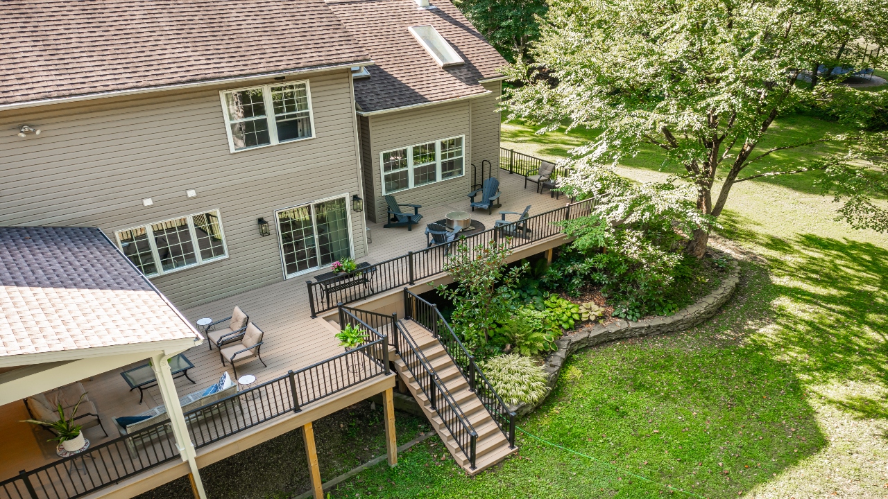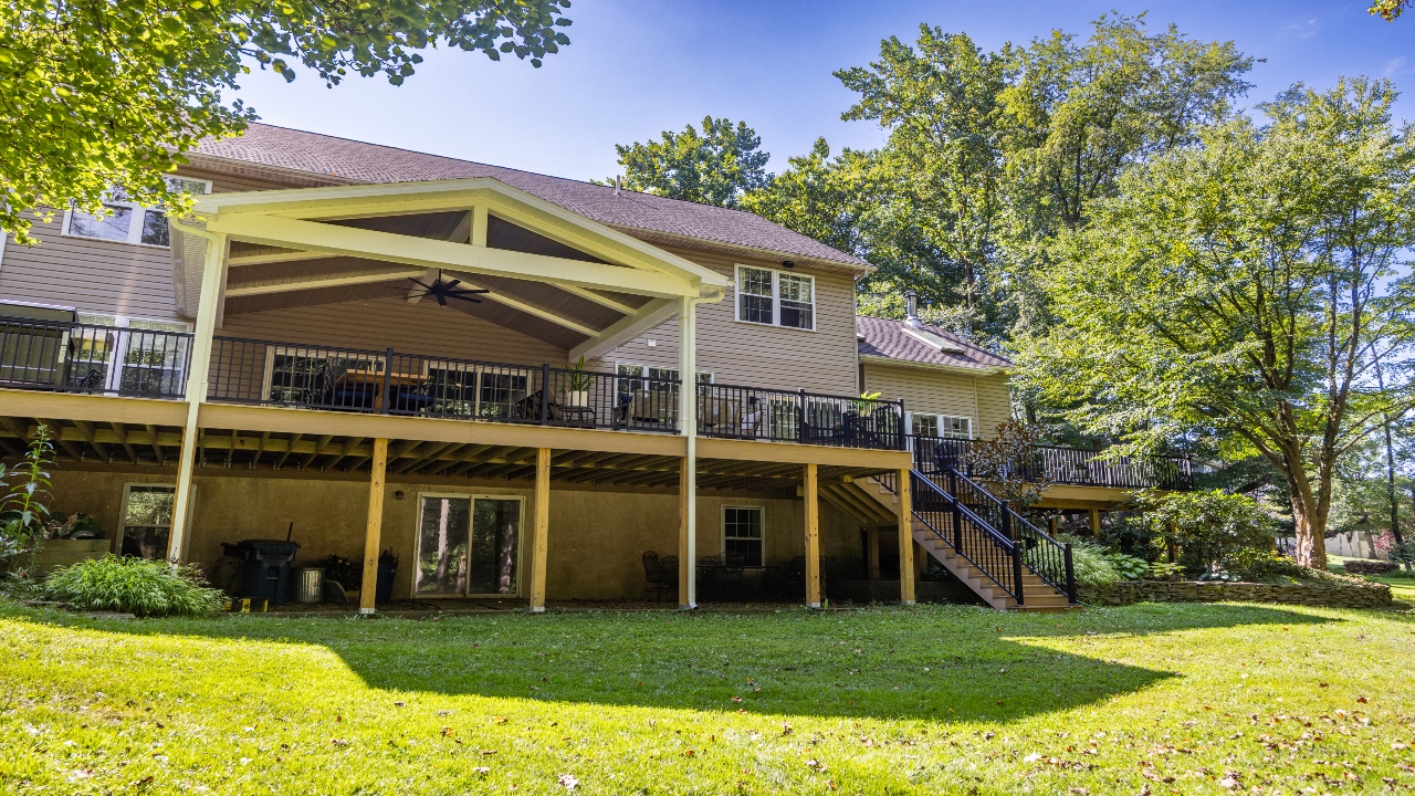 We removed the old deck and built a 1,200 sqft composite deck. The new deck incorporates multiple access points to the yard and second story, seamlessly integrating with a connecting stamped concrete walkway to create a cohesive backyard environment. We built an A-frame style roof with a finished cathedral ceiling over a section of the deck to create a perfect place to dine during hot sunny days.