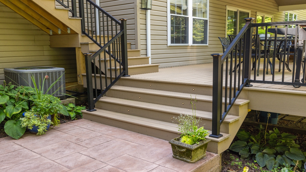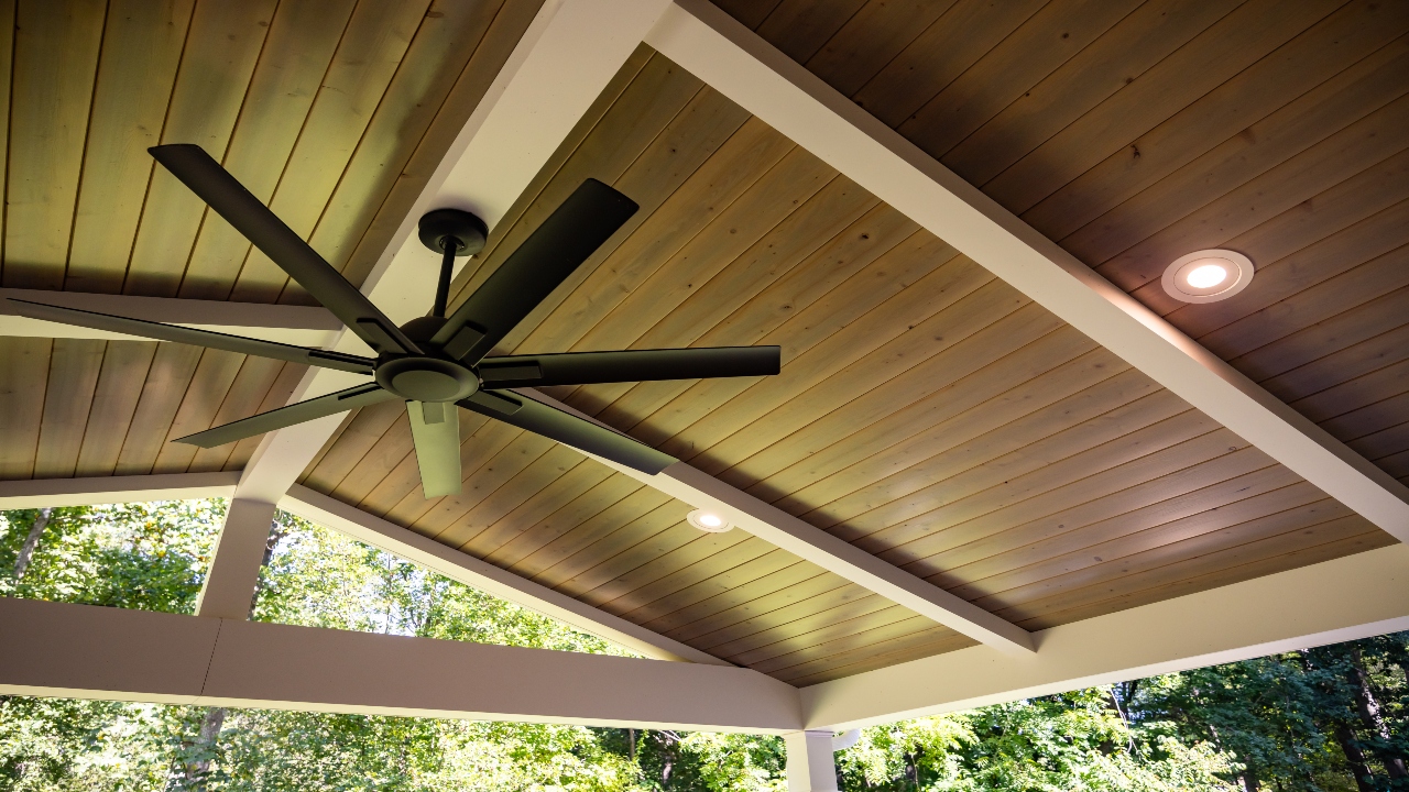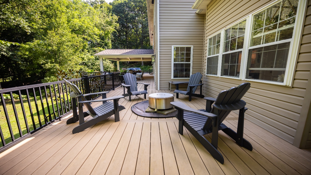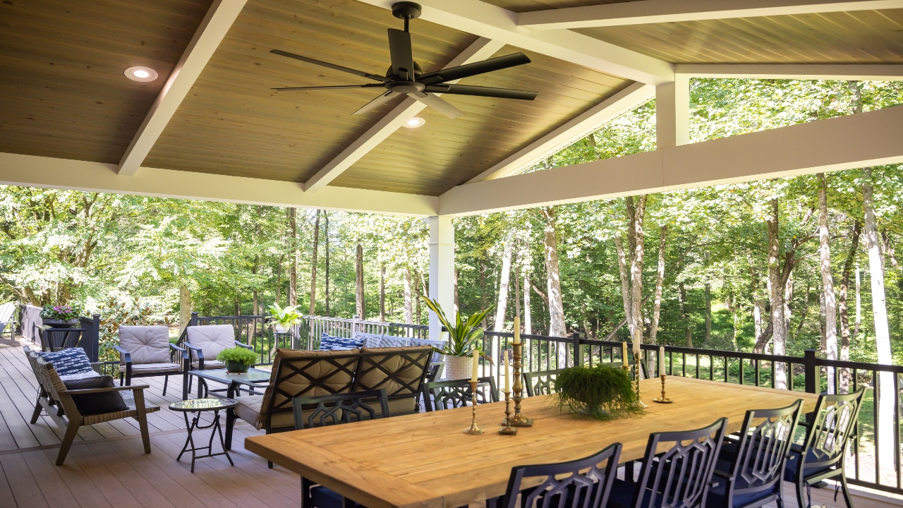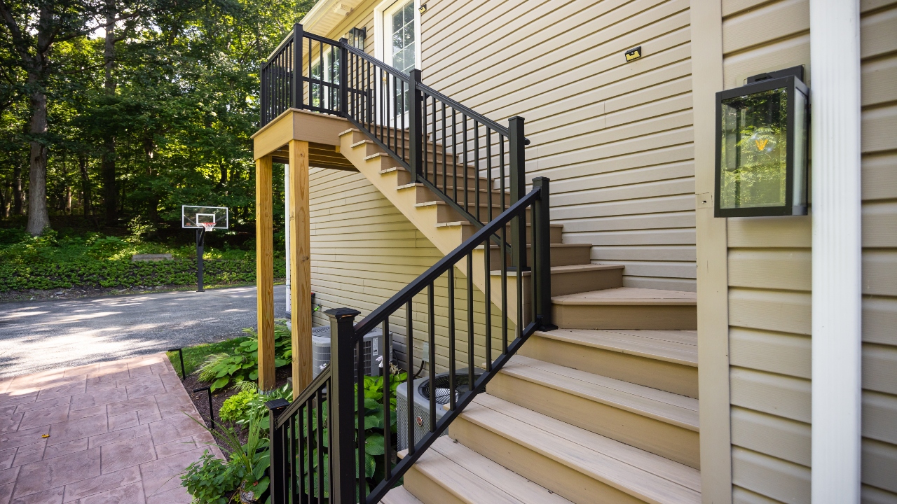 We removed the old deck and built a 1,200 sqft composite deck. The new deck incorporates multiple access points to the yard and second story, seamlessly integrating with a connecting stamped concrete walkway to create a cohesive backyard environment. We built an A-frame style roof with a finished cathedral ceiling over a section of the deck to create a perfect place to dine during hot sunny days.