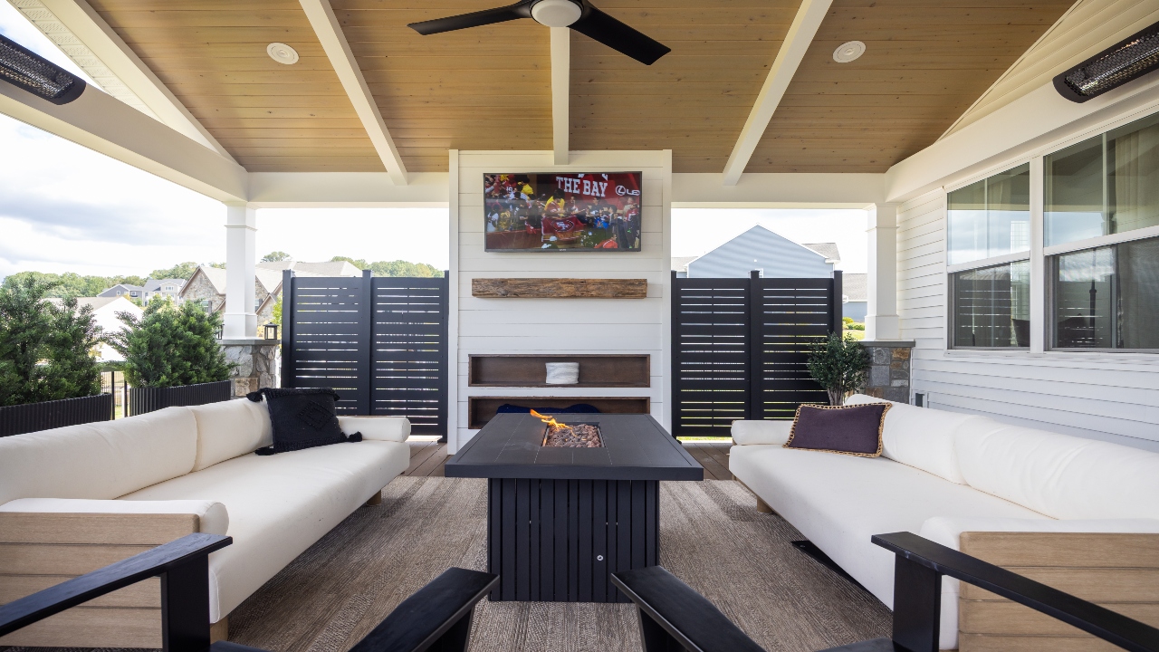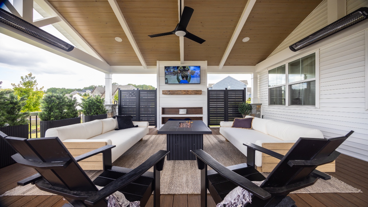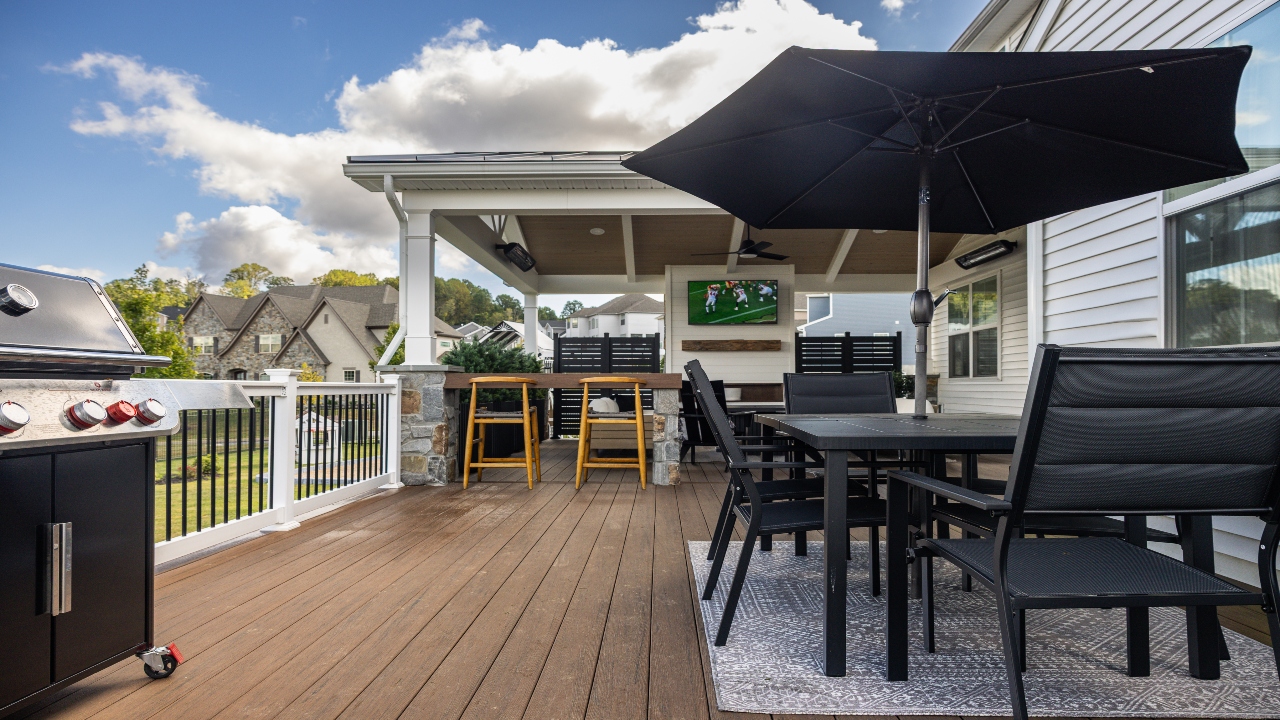 We designed an A-frame style roof to create more of a homey atmosphere to the existing deck while keeping the other side open for grilling and sun exposure. We added a TV wall to create a focal point for the porch. The back of the wall is finished with a Provia veneer or equivalent, while the face and sides are covered in white vinyl shiplap. Black aluminum Hideaway brand privacy screens were installed to create a sense of seclusion and define the space. Off to the side, we added a 6-foot-long breakfast bar, perfect for morning coffee or just casual lounging.