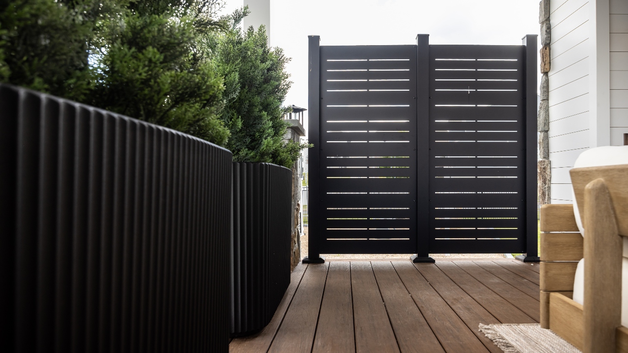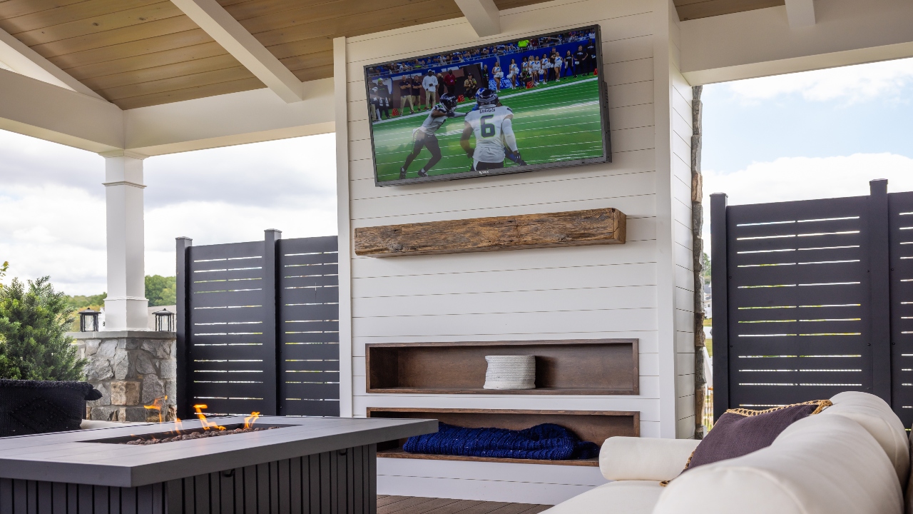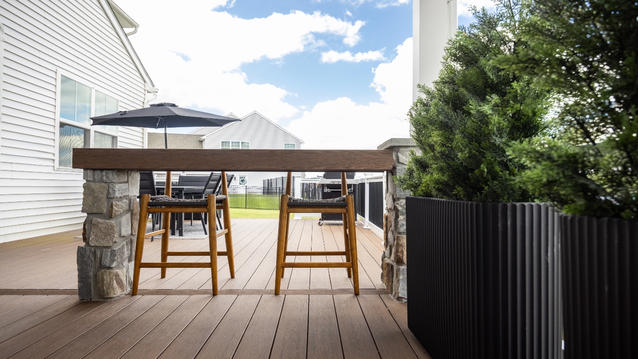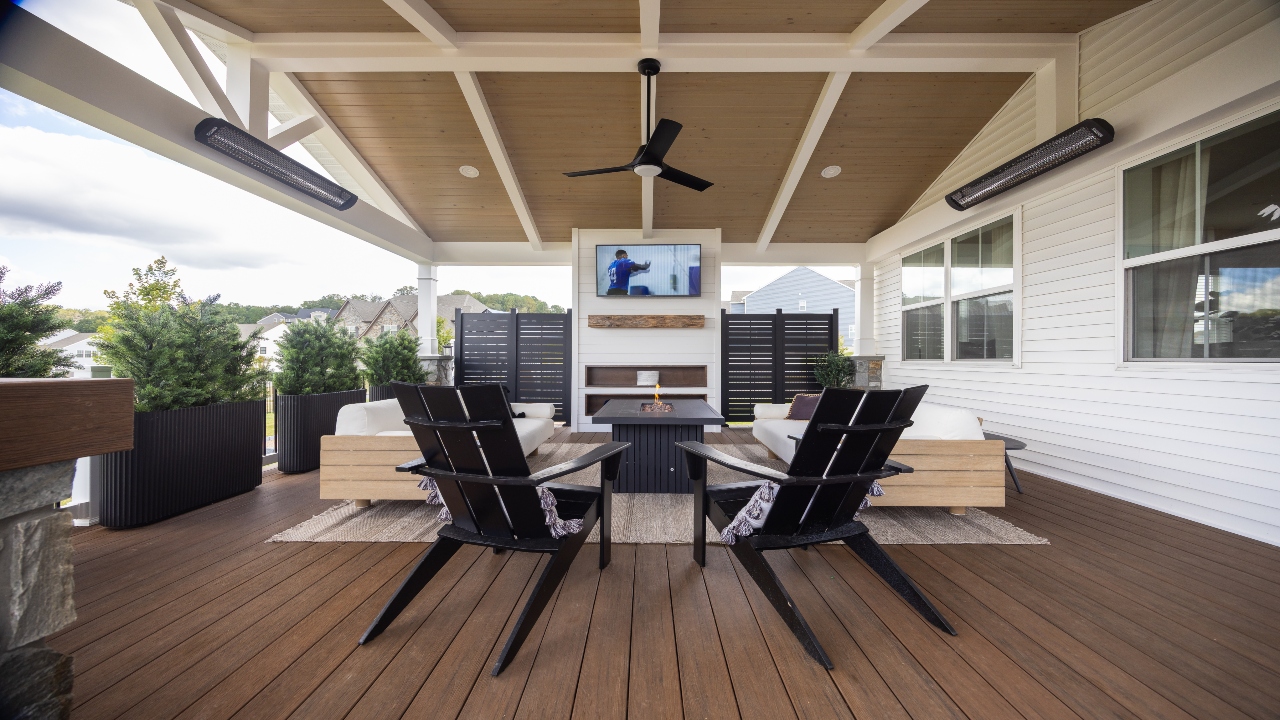 We designed an A-frame style roof to create more of a homey atmosphere to the existing deck while keeping the other side open for grilling and sun exposure. We added a TV wall to create a focal point for the porch. The back of the wall is finished with a Provia veneer or equivalent, while the face and sides are covered in white vinyl shiplap. Black aluminum Hideaway brand privacy screens were installed to create a sense of seclusion and define the space. Off to the side, we added a 6-foot-long breakfast bar, perfect for morning coffee or just casual lounging.