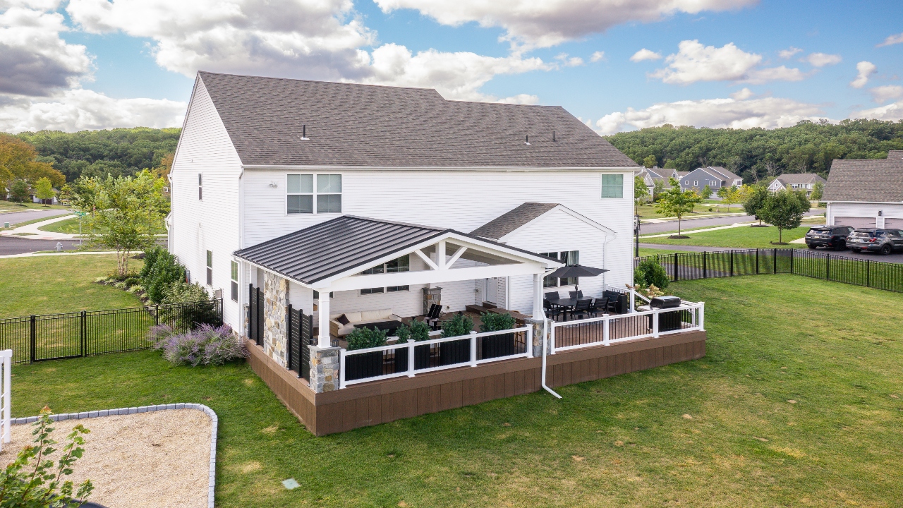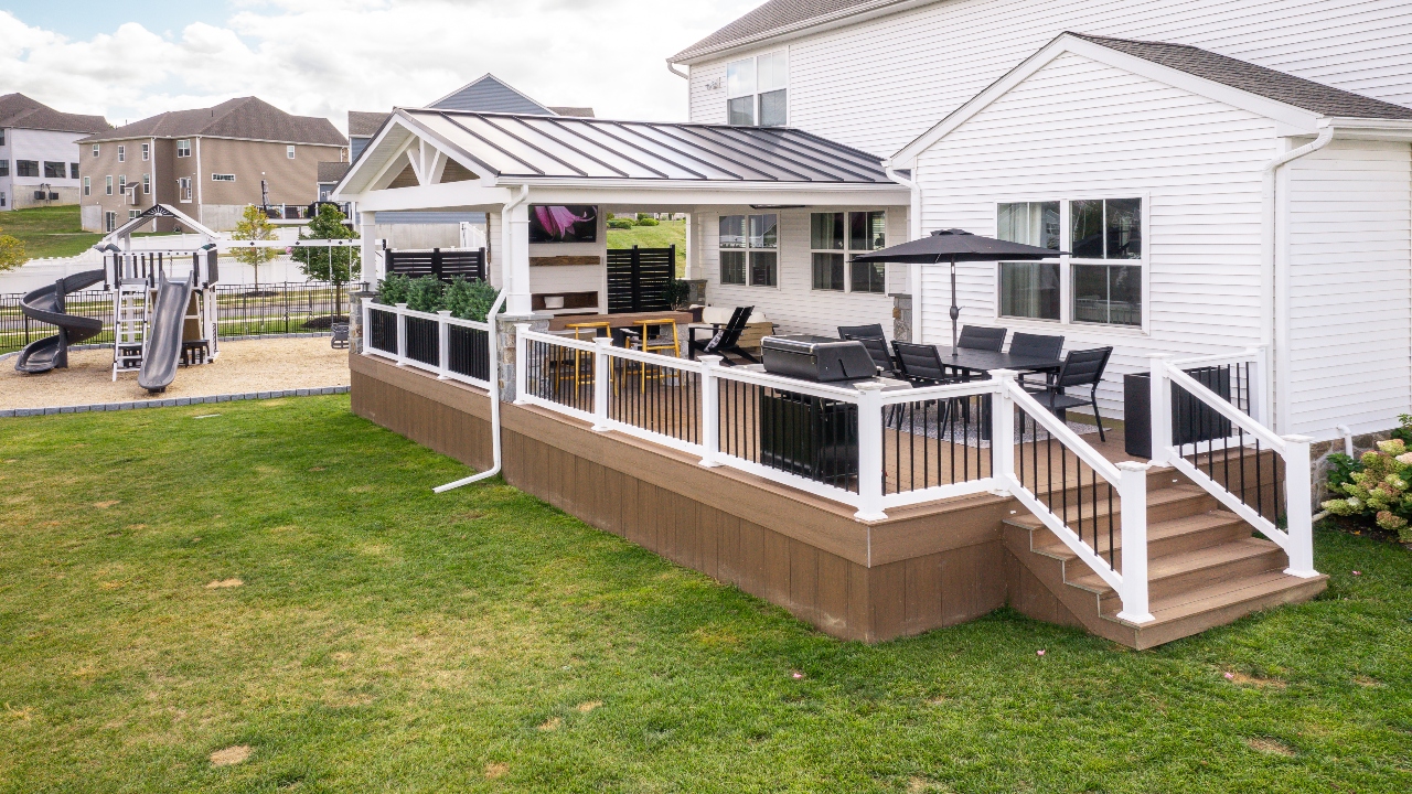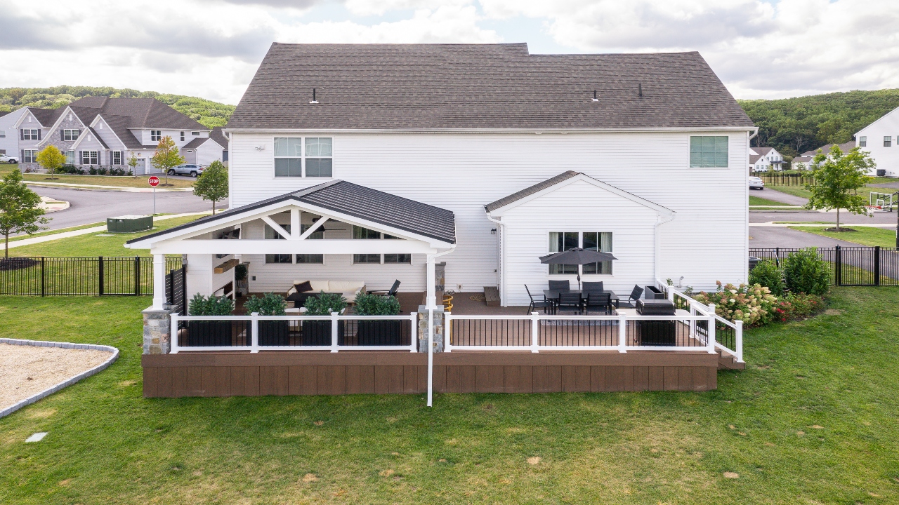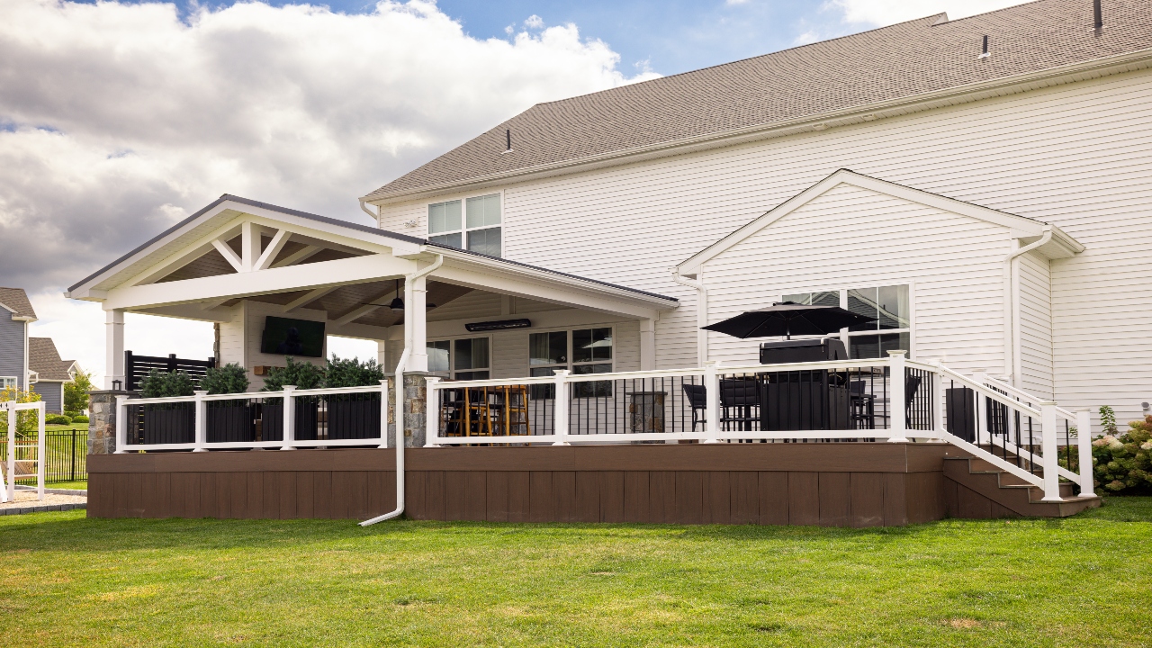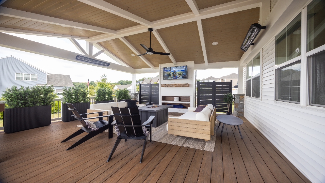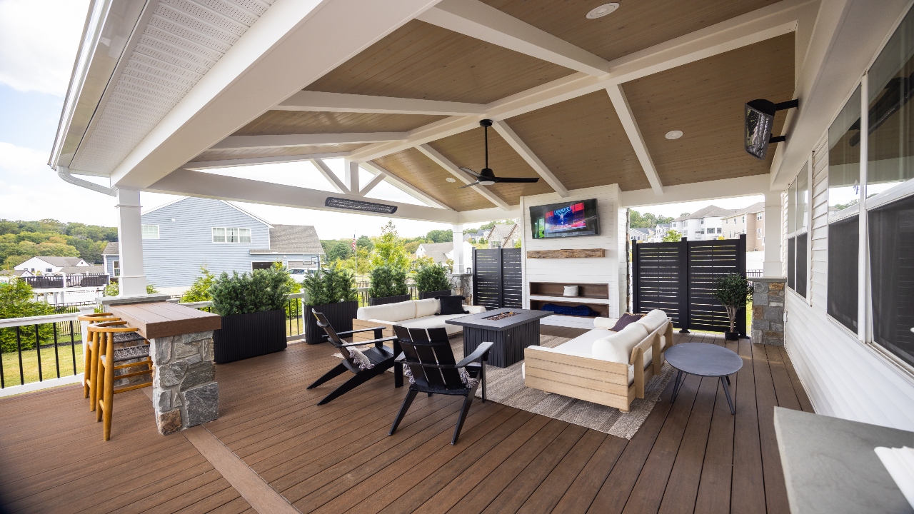 This custom project for a homeowner in Newtown Square, PA, transformed an existing deck into a luxurious, covered outdoor living space perfect for year-round entertaining and relaxation.